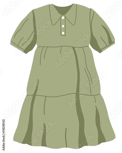 Kids girls summer dress with collar, buttons and sleeves. Little childs clothes. Modern small girly apparel, wearing. Girlish childish garment. Flat illustration isolated on white background
