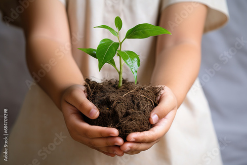 Kid's hands holding a young plant. New life. Care and protection. Close-up.