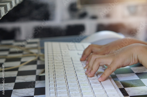 Kid's hands typing keyboard on computer desk