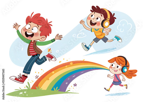 Kids jumping and smiling over rainbow path / Niños saltando y sonriendo sobre camino de arcoíris