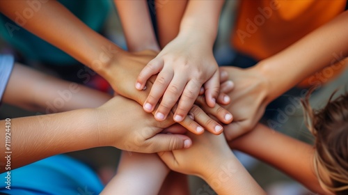 Kids stacking their hands, symbolizing teamwork and camaraderie in a kindergarten group collaboration and unity among young children.