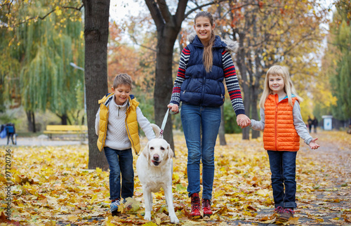 dog, boy, park, autumn, male, friends, outside, smile, young, person, beautiful, nature, pet, happy, animal, love, human relationships, leisure, friendship, labrador, retriever, female, human, playful, three, fun, walking, people, affection, kind, leaf, yellow, white, sand, active, playing, cute, lifestyle, brother, training, sister, together, trusting, hug, caucasian, breed, terrier, small, girl