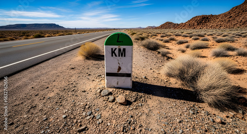 Kilometer Marker Shows Distance on An Empty Desert Road Trip Adventure