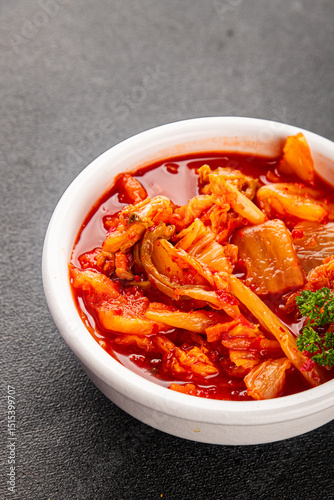 Kimchi pickled cabbage salad spicy savory vegetables fresh delicious gourmet food background on the table rustic food top view copy space vegetarian and vegan food