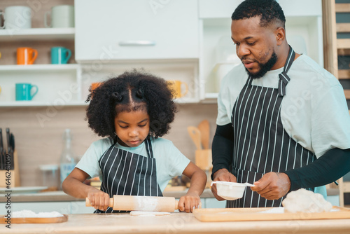 Kind African american parents teaching their adorable daughter how to cook healthy food, free space of kitchen, Happy black people family preparing healthy food in kitchen together