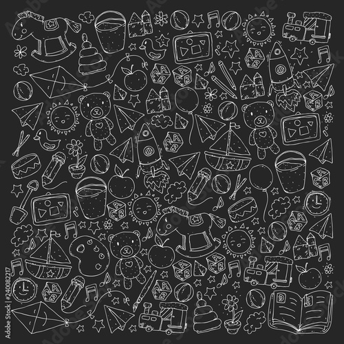 toy, play, kindergarten, study, education, teddy, bear, sun, duck, bucket, pattern, drawing, doodle, vector, ship, balloon, crayons, game, lesson, learning, item, image, horse, rocket, space, sail, icon, collection, grow, apple, learn, paint, music, class, background, children, small, boy, girl, picture, chalk, blackboard, board, black, blackboard