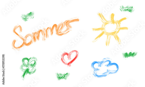 brushstroke, flower, watercolor, sun, element, drawing, kindergarten, cardiac, cloud, grass, buntstifte, enrollment, decoration, orange, infant