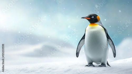 penguin, standing, snowy, falling, winter, animal, cold, wildlife, antarctic, bird, snow, environment, landscape, ice, climate, nature, outdoors, day, closeup, emperor, king, flightless, feather, isolated, white, black, orange, cute, 1, background, soft, scene, habitat, south, pole, species, protection, glacé, freedom, calm