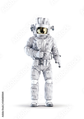 Kitchen chef astronaut / 3D illustration of space suit and chef hat wearing male figure holding large cooking knife isolated on white studio background