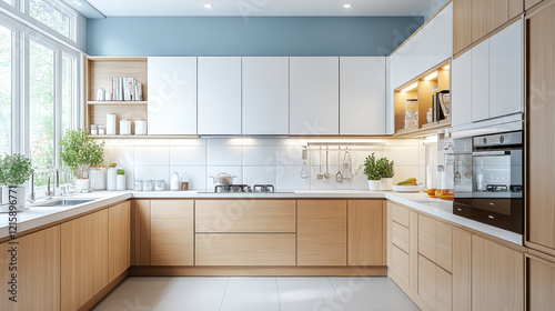 kitchen in a modern style with a lot of cabinets