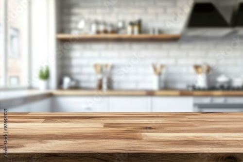 kitchen table background, wood counter top on blur of white clean abstract home interior with bokeh. used for display or montage your wooden for dining background. tabl banner, podium , ai