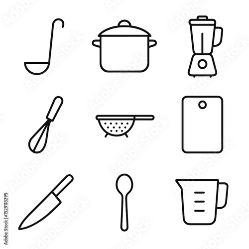 kitchen, utensil, icon, outline, icon, set, ladle, soup, pot, blender, whipped, strainer, chopping, board, knife, spoon, measuring, jug