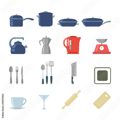 flat, modern, creative, style, stylish, vector, icon, set, icon, collection, signs, symbol, illustration, design, infographic, infographic, cookware, kitchen, cook, cooking, hot drink, maker, frying, pan, pot, kettle, scale, glasses, rolling, pin, plate, dish, cutlery, knife, goblet, cutting, board, cup, fork, spoon, kitchen utensile, tool, utility, object