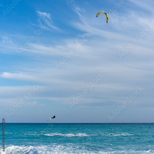 kite, board, sea, wave, horizon, sky, cloud, daytime, summer, ocean, beach, leisure, sport, adventure, fisheye, blue, white, yellow, exciting, adventurous, freedom, serene, parachute, paragliding, paragliding, surf, surfing, water, fly, wind, fun, surfer, air, sport, vacation, extreme, flying, kitesurfing