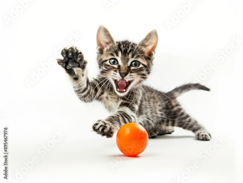 kitten playing with ball, white background