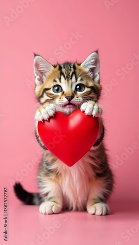 Kitten surrounded by red heart in playful pose on soft pink surface, heart, cuddly