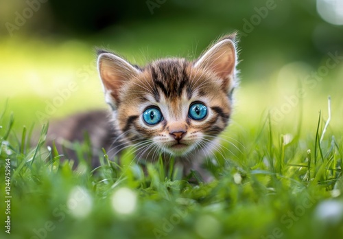 Kitten with Bright Blue Eyes: An adorable tabby kitten with captivating bright blue eyes sits in a lush green grass, looking directly at the camera with an innocent and curious gaze.