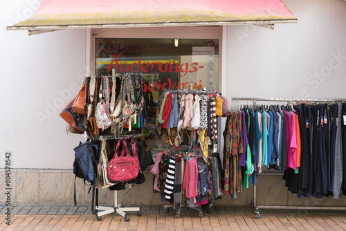 Kleidung und Handtaschen aufgehängt vor einer kleinen Boutique
