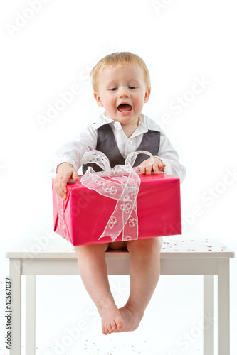 birthday, small, boy, 1, year, gift, celebration, tight, table, sitting, posh, present, surprise, high, live, festive, eltern, invitation, photo studio, portrait, release, background, white, children, baby, creche, kindergarten, leg, dangle, stress, taut, expectation