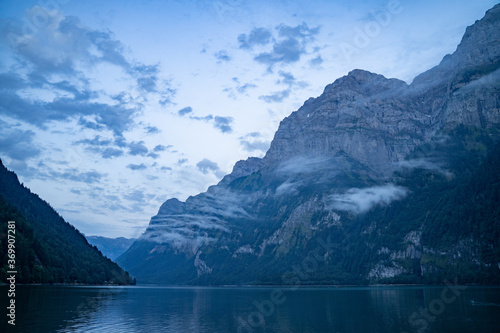 Klöntalersee in der Schweiz bei Sonnenaufgang