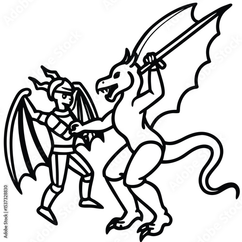 knight, dragon, battle, fight, combat, sword, winged, fantasy, mythical, creature, illustration, drawing, black, and, white, line, art, vector, graphic, mediaeval, hero, monster, legend, fairy, tale, myth, artwork, design, element, clip art, silhouette