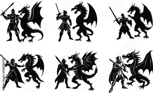 Knight fighting dragon silhouette black vector art design set