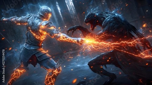 knight, dragon, fantasy, battle, epic, fight, warrior, monster, fire, energy, mythical, creature, clash, combat, armoring, glowing, magical, powerful, darkness, light, digital artwork, illustration, artwork, fantasy art, video game, imaginary