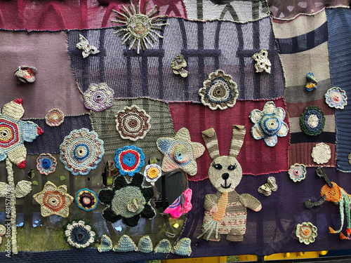 rabbit, caterpillar, rabbit, flower, old, worn, threaded, art, street art, fence, three-dimensional, wall covering, covering, outside, pretty, lovely, beautiful, artistic, custom, europa, preschool, elementary school, kindergarten, day care, yard, decoration, beautify, wool, colourful, creative, hobby, recreation, fun, together, lightened, cover, hanging, large, wide