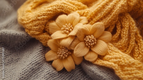 foulard, flower, knitted, yellow, closeup, texture, soft, fabric, detail, fashion, design, home, decor, textile, autumn, winter, accessory, background, grey, colours, sweater, spring, knit up, pattern, hand-made, decorative, closeup, softness, comfort, warm, autumn, style, modern, vintage, trendy, stylish, craft, cosy, neutral