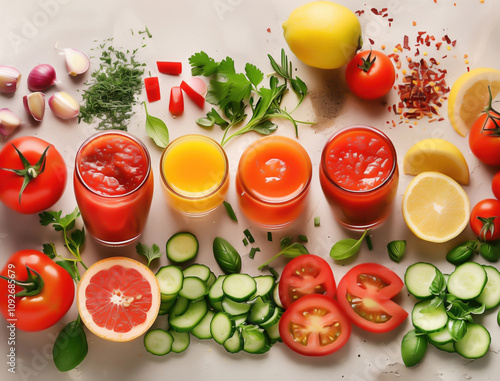 Knolling arrangement of fresh Gazpacho ingredients on beige background, top view