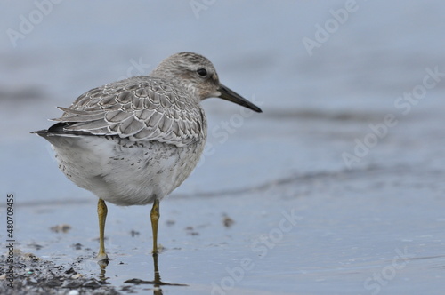 Knot feeding on the sea coast. A young, gray bird gains food during its autumn migration to wintering grounds by the Atlantic Ocean.