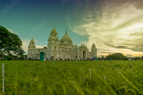 Kolkata, West Bengal, India - July 16th 2017 : Beautiful image of sun set with Victoria Memorial buliding - a landmark public buiding of Kolkata, famous tourist attraction.