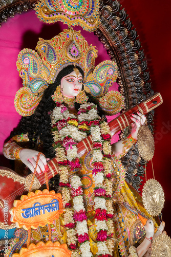 Kolkata,West Bengal,India - 10th February 2019 : Idol of Goddess Saraswati with veena, a musical instrument being worshipped. Hindu goddess of knowledge, music, art, wisdom, and learning.