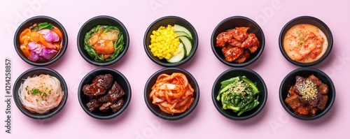 Korean BBQ. Colorful array of Asian dishes in black bowls on a pink background.