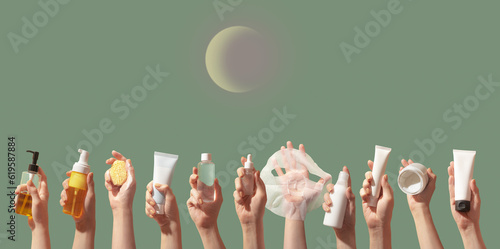 Korean care system cosmetic bottles, jars, tubes green background. Peeling, cleansing oil, mask, foam, toner, shit mask, sun cream