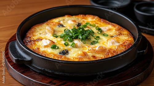 Korean food concept. A delicious dish featuring a golden, cheesy crust topped with green onions, served in a sizzling stone pot.