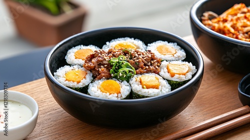 Korean food concept. A vibrant bowl of sushi rolls topped with savory ingredients, served alongside dipping sauce, exemplifying Asian cuisine.