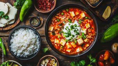 Korean tofu stew Sundubu Jjigae served rice normal view of sundubu jjigae a hot tofu stew served with rice and side dishes on a rustic wooden table