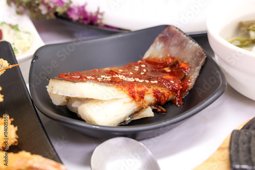 spicey, sauce, korean, korea, marinated, steamed, ray, fresh, dish, meal, food, delicious, cookery, korean food, stingray, plate, lunch, anchovy, healthy, traditional, stew, bread, table, white, tomatoes, red, vegetable, epicure, vegetable