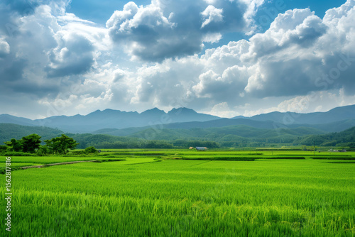 korean_rice_fields_summer Lush green rice fields in summer with distant mountains and fluffy clouds, vibrant rural Korea