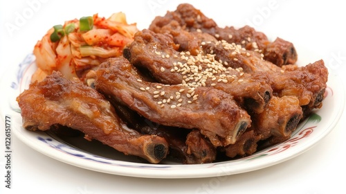 Korean-style ribs served on a ceramic plate with sesame seeds and kimchi on the side, isolated on a white background.