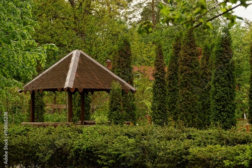 bower, building, architecture, garden, park, brown, pavilion, bush, greenery, vegetation, plant, tree, exotic, green, flora, botany, botanical, nature, landscape, summer, spring, browse, leaf, needle, balustrade, framework, roof, vacation, blank