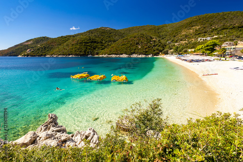 Krajobraz letni, grecka wyspa Lefkada, niebieski kolor, relaks i wypoczynek, Morze Jońskie, tło do projektu, tapeta
