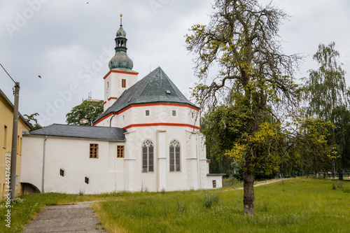 Krasne Brezno, Bohemia, Czech Republic, 26 June 2021: Saxony style renaissance church of St. Florian with white tower and gothic windows, National cultural monument in summer day