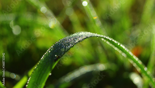 Kropelki porannej rosy na źdźble trawy