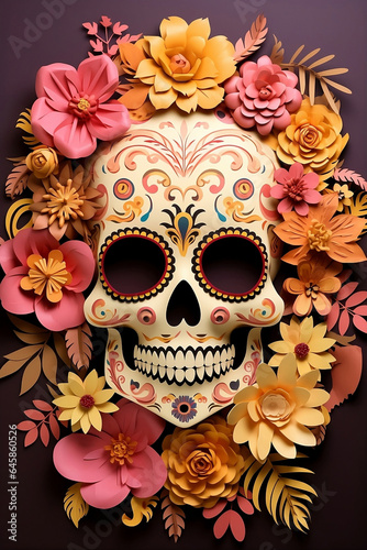 kull referring to Mexican tradition, Day of the Dead offering, represents catrina, with doodles on the face, pink and yellow flowers around on a purple background, paper technique.