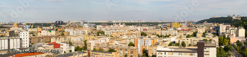 Kyiv, Ukraine – July 08, 2017: A beautiful panorama of Podil area. Aerial view on residential and industrial areas. A lot of buildings of different architectural style. Historical area, Dnipro river.