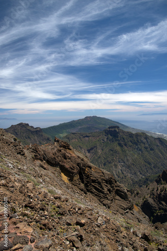 mount, peak, crater, mountain, coast, panorama, volcano, countryside, caldera, hillside, sheer, atlantic ocean, canary island, heaven, blue, cloud, la palma, africa, atlantic, europa, island, upright format, spain, brown, green, white