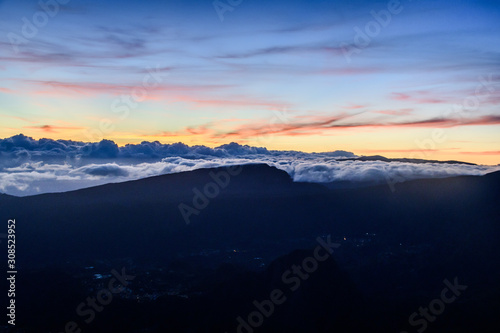 sunset, sky, sunrise, landscape, mountain, nature, cloud, sun, mountain, fog, morning, cloud, dawn, blue, panorama, hill, evening, light, dusk, view, vale, sunlight, orange, colours, mist, saint-pierre, saint paul