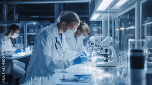 Lab technicians conduct experiments with microscopes and samples during a research session at a scientific laboratory at night